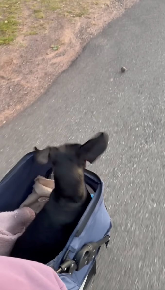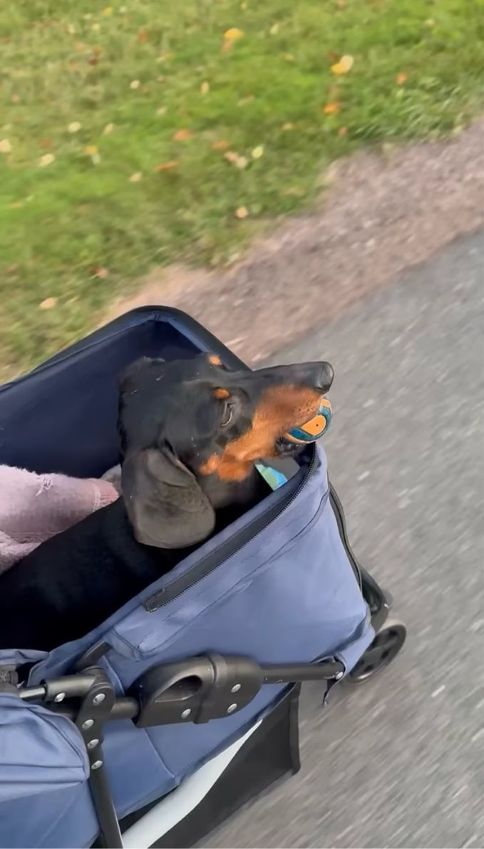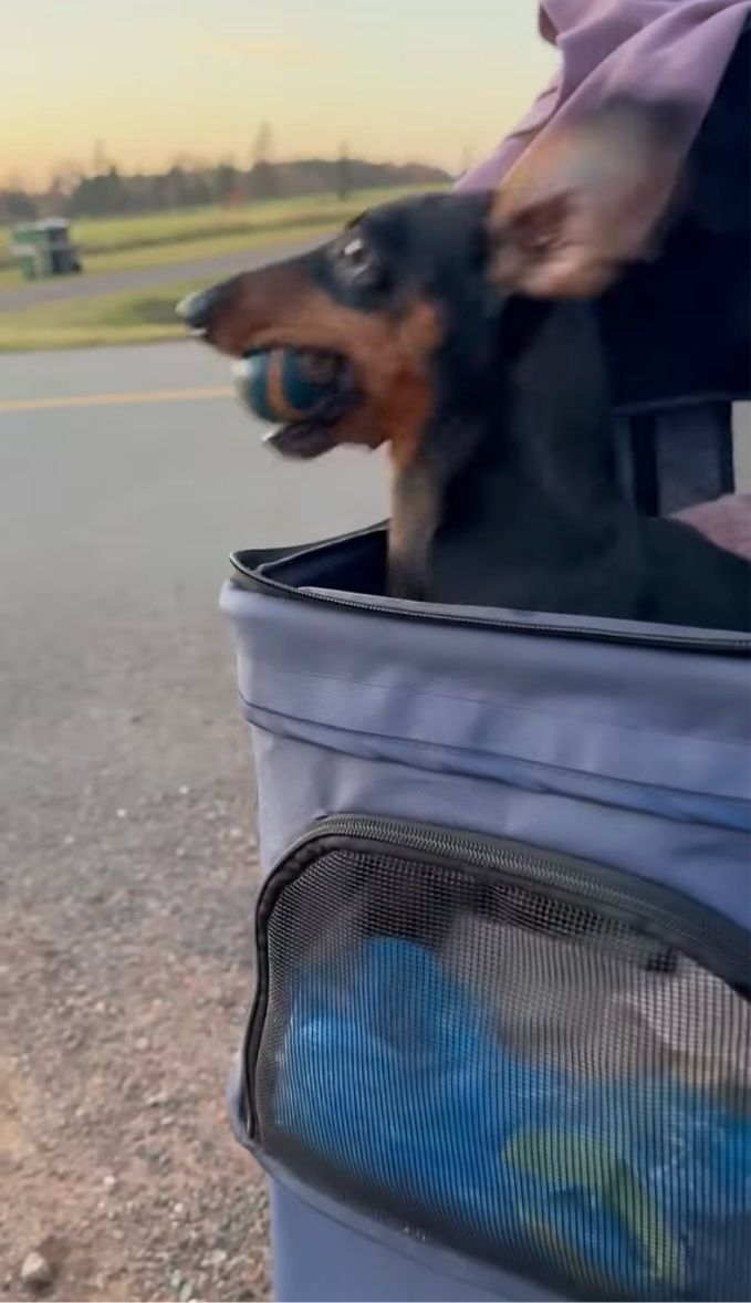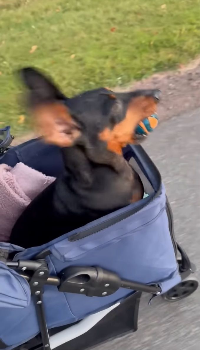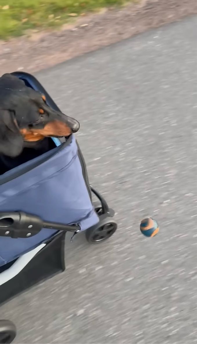 カートに乗っておさんぽしていたダックスフンドは、お気に入りのボールをくわえてご機嫌でした。 ところが、このあと思わぬハプニングが起きてしまい・・大焦りするのです。