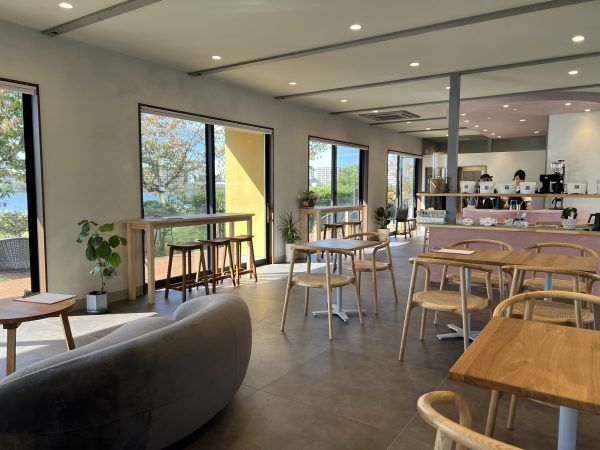 なんとも開放感のある店内!30席あり、ゆったりとしたカフェタイムを過ごせます!!外観の雰囲気とは違ってスタイリッシュな空間です。大きな窓からは多々良川が見渡せます。今後は展示会や貸しスペースとしての利用も検討しているそうです。