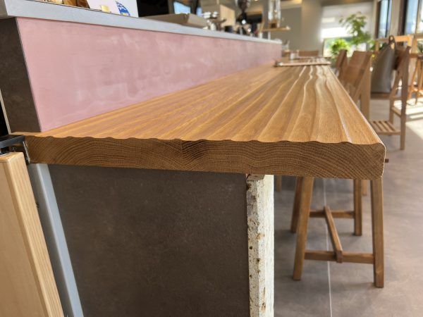 店名の minamo(ミナモ) は多々良川のキラキラ光る水面からとったそうです。それをイメージして作られたカウンターテーブルは、お店のロゴと同じで波打っています。敢えてコーヒーを淹れる過程が見える高さにもなっています。壁の部分には万能な石材の「大谷石」が使われ、異素材との調和で心地よく過ごしやすい空間づくりがなされています。店舗の外側、正面入り口付近にも水面をイメージした工夫が施されているのでぜひ探してみてください!