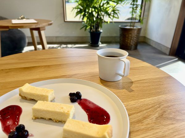 ベイクドチーズケーキはしっとりなめらか食感、爽やかな甘みがクセになる美味しさでした。添えられたブルーベリーのソースがほどよいアクセントになっています。カップとプレートは、有田焼のブランドシリーズ「1616」シンプルなデザインとマットな質感でカフェタイムのコーディネートにピッタリです。