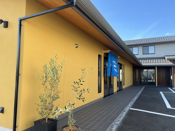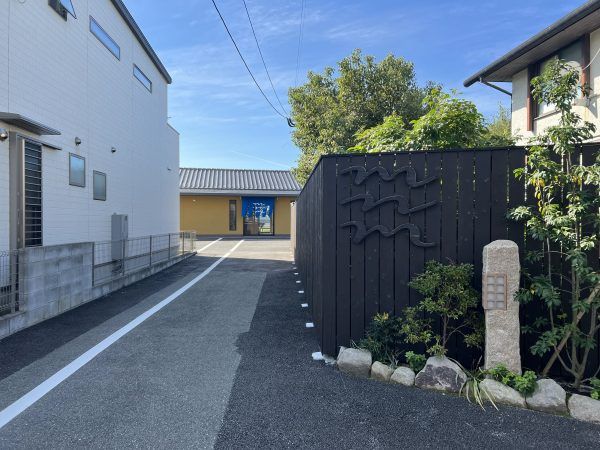 車で走っていたら通り過ぎてしまうかもしれません。その建物は通りから少し奥まった場所にあります。ひらめく青い暖簾とその外観から和モダンな雰囲気が漂います。もしかして旅館?と思われる方もいるかもしれません。
