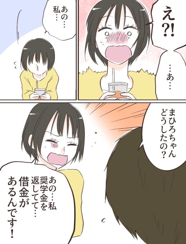 「え!?・・あ・・あの・・私・・」突然の告白に動揺したまひろさん、「まひろちゃん、どうしたの?」彼にそう言われて「あの・・私、奨学金を返してて・・借金があるんです!」と勇気を出して伝えました。