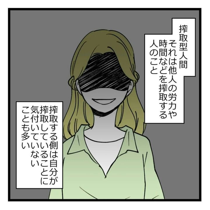 搾取型人間とは相手の時間や労力を奪って、自分に利がでるようにする人のことです。りえさんのように、断ることが苦手な人は、よく搾取型人間のターゲットになってしまいます。