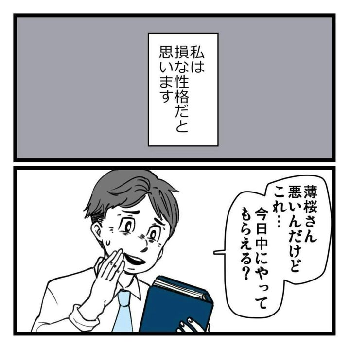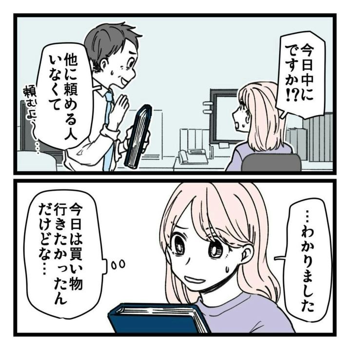 主人公はりえさん。りえさんはお願いをされると断れない性格でした。そのせいか、同期のK子からはよく企画の手伝いをお願いされます。最初のうちは頼られるのが嫌ではなかったというりえさん。しかし、だんだんとK子から搾取されていると感じることが増えていき、ついには退職することを決意するのでした。