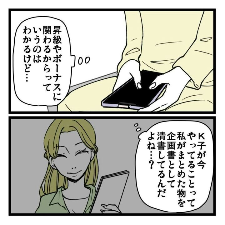 K子もこの搾取型人間。りえさんに企画の手伝いをさせて、自分はあまりやらないこともしょっちゅうです。企画内容を人に進めさせて、自分は発表のときだけ…。りえさんは自分がゴーストライターになっていることに気が付きます。いくら素晴らしい企画を作っても、どれだけ時間をかけても、その評価はK子のものになってしまいます。