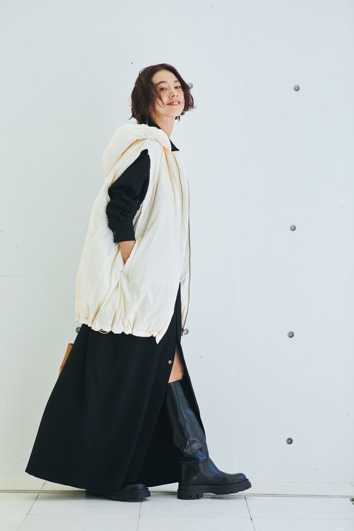 タフタ素材のダウンはボリューム少なめで、どんなスタイルにもサラッと合うのが魅力。緩めのロングワンピースにもバランスを崩さず似合い、ほんの少しラフさを加えてくれます。ダウンベストはネイヴ、ワンピースはリネイヴ、ブーツはペリーコのもの。