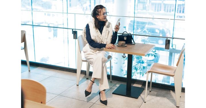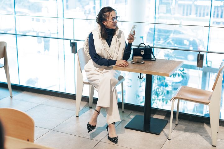ショート丈でキルティングなしのダウンベストはキレイめパンツとも相性◎。白パンツにパンプスのコンサバスタイルを、ほんのりモードに仕上げてくれます。インナーを薄手のニットにしてメリハリを出すのがおすすめです。ダウンベストはアダム エ ロペ、ニットはジョンスメドレー、パンツはロエフ、パンプスはミラ オーウェン、バッグはカフネのもの。