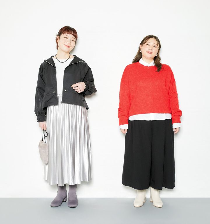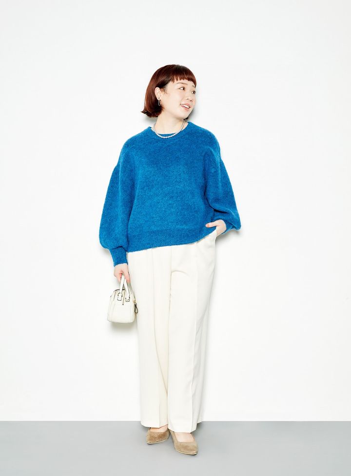 ニットプルオーバー フリーサイズ(S-3L対応) ¥15,664/CAWAII(ワンピース) ワイドストレートパンツ 1〜14 ¥4,620/リブ イン コンフォート(フェリシモ) イヤリング ¥1,090、ネックレス ¥1,990/共にCream dot. 本革バッグ ¥14,900/HAYNI ポインテッドトゥパンプス 33(22-22.5cm)〜41(25-25.5cm) ¥3,590/AmiAmi(ビーンズ)