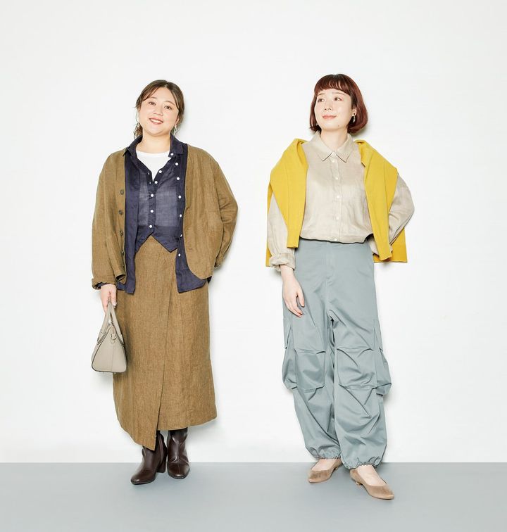 肩に掛けたカーディガン 1、2 ¥8,990/エウルキューブ リネンシャツ XS〜XL¥5,990/ZARA(ザラ カスタマーサービス) パンツ 3(15-17号相当)、5(19-21号相当) ¥19,580/アズ ノゥ アズ オオラカ(アズ ノゥ アズ) イヤリング ¥1,090/Cream dot. パンプス 21.5〜26.5cm ¥2,999/menue(welleg)