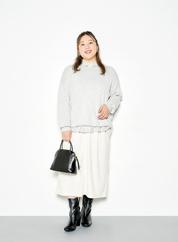 コットンニットプルオーバー M-L〜LL-3L ¥3,190/ecoloco(エコロコ) ストライプシャツ XS〜XXL ¥5,990/ZARA(ザラ カスタマーサービス) リブナロースカート フリーサイズ、プチフリーサイズ、(以下WEB限定)LL-4L相当プラスフリーサイズ ¥5,940/スタディオクリップ(アダストリア) イヤリング ¥1,490/Cream dot.本革バッグ ¥17,900/HAYNI スクエアトゥストレッチブーツ SS〜3L ¥4,499/menue(welleg)