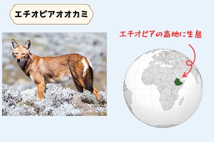 エチオピアオオカミはその名の通り、”アフリカの角”に位置するエチオピアに分布し、その中でも特に標高3000〜4400メートルの高地に広がる草原に生息しています。