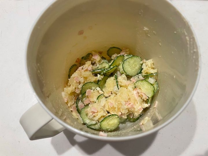 2. じゃがいもを潰し、ハム、玉ねぎ、きゅうりを容器に入れる。