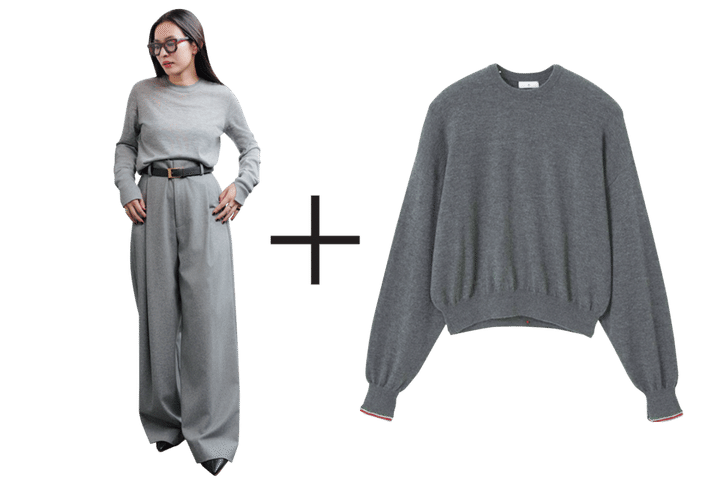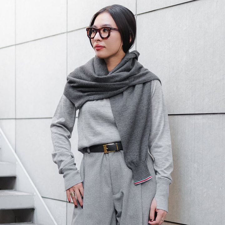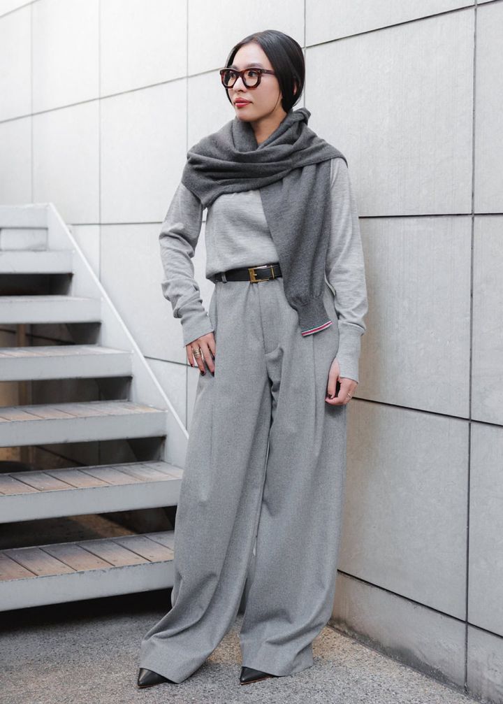 「冬に着たくなるグレーのワントーンは、どうしてものっぺりしがちですが、濃度の違うグレーを重ねるだけでグッと立体感のあるスタイリングに。カシミアのプルオーバーは袖口にカラーの縁取りが施されているのでさり気ないアクセントにも」(山野邉彩美さん)