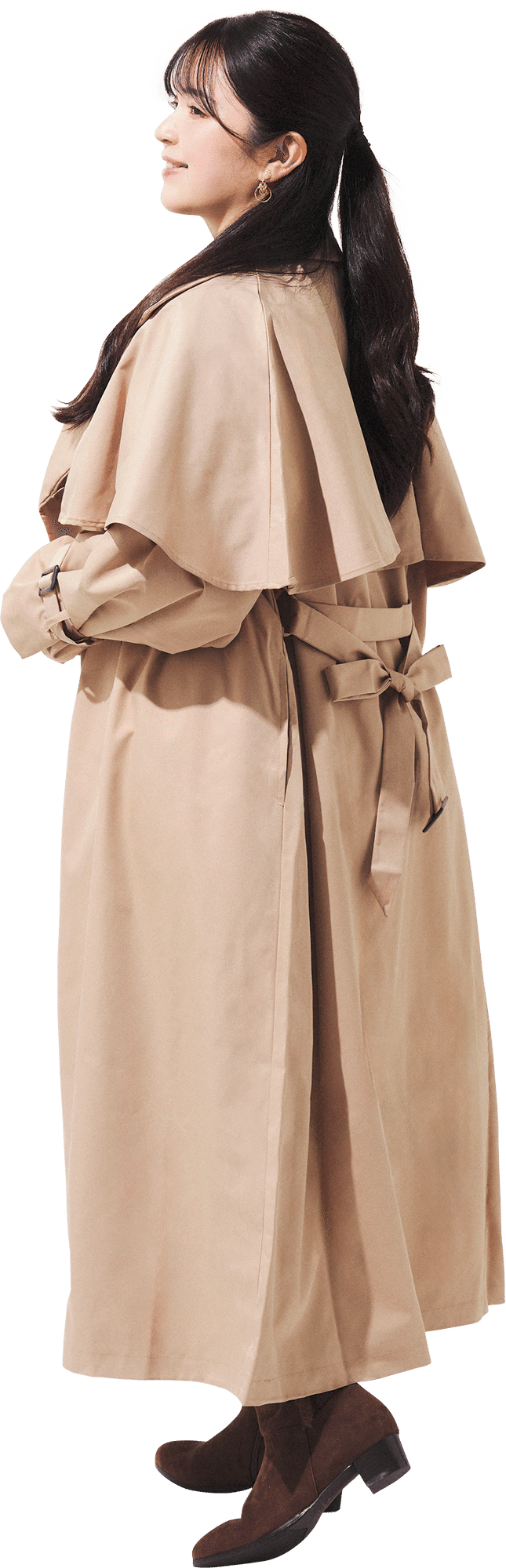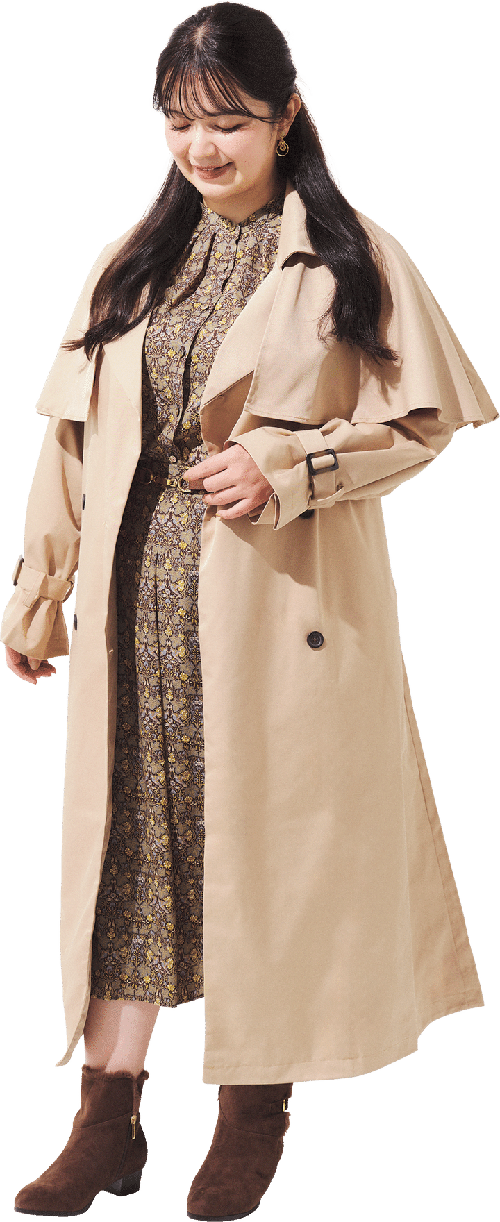 ケープ付き2WAYトレンチコート 3L、4L ¥6,930、ビットバックルゴムベルト フリーサイズ ¥2,530/共にクレット スタンドカラー7分袖ブラウス L13~L23号 ¥25,300~¥28,600、タックフレアスカート L13~L23号 ¥28,600~¥31,900/共にニューヨーカー(ダイドーフォワード) イヤリング ¥1,650/OSEWAYA(お世話や) ファー付きショートブーツ 21.5~26.5cm ¥35,200/卑弥呼