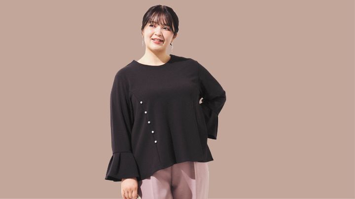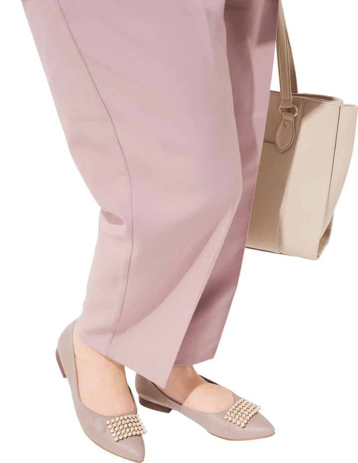 プルオーバーブラウス M~5L ¥6,600/LAVEANGE テーパードパンツ LL~4L ¥5,489/Re-J&SUPURE イヤリング ¥3,300/コトモノマルシェ ルミネエスト新宿店 トートバッグ ¥27,500/ダイアナ(ダイアナ 銀座本店) パールビジューバックルパンプス 25~27.5cm ¥22,000/grandegrande(早川製靴)