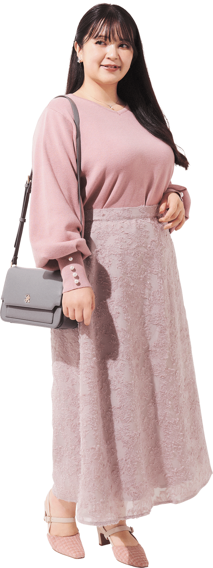 Vネックセーター L-LL~5L-6L ¥3,990/A HAPPY MARILYN フリンジフレアスカート 3L~5L ¥2,970/クレット イヤリング ¥25,300、ネックレス ¥23,100/共にグロッセ(グロッセ・ジャパン) ショルダーバッグ ¥9,350/ジュエルナローズ新宿ミロード店 バックストラップパンプス 22~26cm、(以下WEB限定)21.5、26.5cm ¥7,700/オリエンタルトラフィック(ダブルエー)