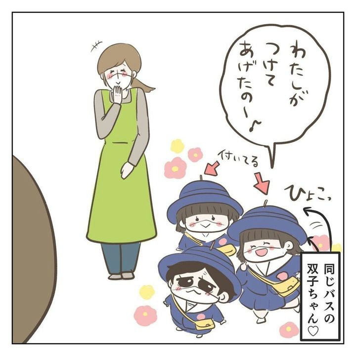 4歳の男の子のママである、ジェーコ(@jeeeeeeeeko)さん。いつものように、幼稚園からバスで帰って来る子どもを迎えに行くと、わが子の帽子に何か刺さっていることに気がつきます。草むらで遊んでいて枝が刺さったのかと思い、聞いてみると…先生からはほっこりする答えが返ってきました。何かが刺さっているのは、わが子だけではなく、同じバスのお友達も同じ姿。ニコニコうれしそうなわが子とお友達の姿を見て、ステキな時間を過ごしたようです。ぜひごらんください。