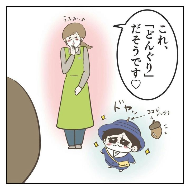 お迎えに行くと、子どもの帽子に枝のようなものが…。この枝は、お友達がわが子を「どんぐり」に変身させるためにつけてくれたものでした。そのお友達の帽子にも同じ枝が!うれしそうなわが子とお友達…3人のかわいいどんぐりの妖精たち…とても癒やされますね。