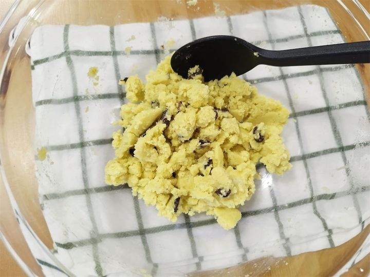 砂糖、バター、シナモン、水気を絞ったレーズンを入れて混ぜます。