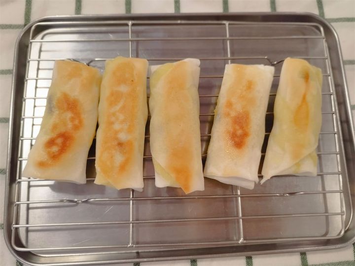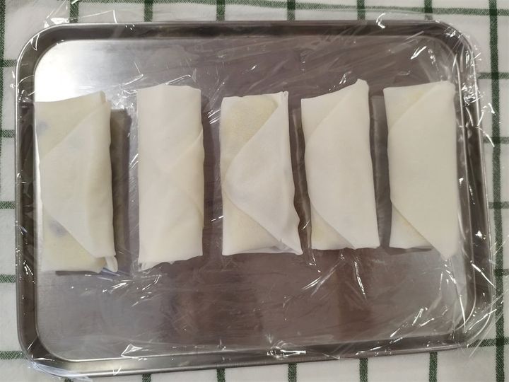 3. 2の生地を5等分にして、春巻きの皮で包む。