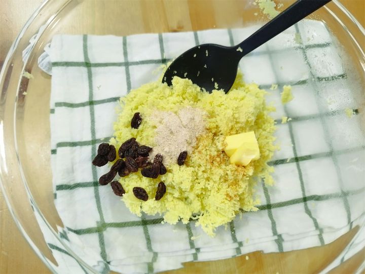 2. レーズンは、湯通しして水気を絞って1のさつまいもに混ぜ、バター、砂糖、シナモンを入れて味を調える。