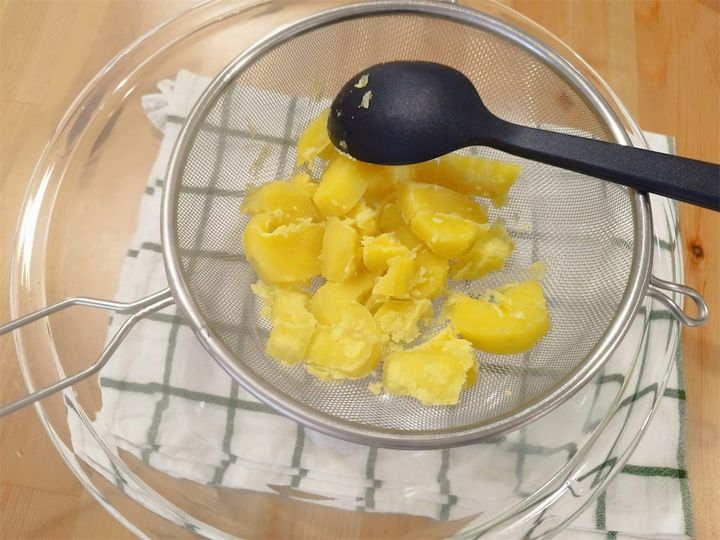 なめらかな食感にしたかったので、やわらかく茹でて熱いうちに裏ごししましたよ。