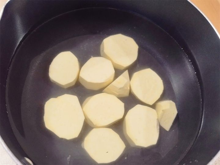 1. さつまいもは、皮を剥いて輪切りにし、茹でてつぶす。