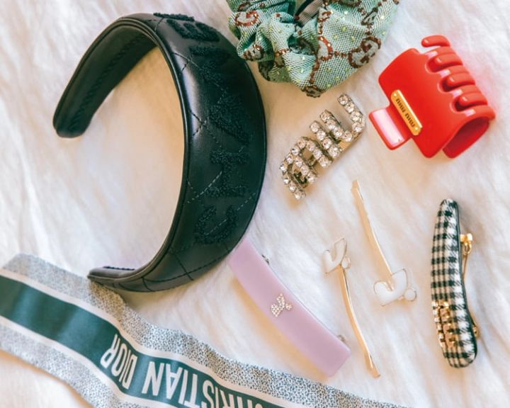 小物なら、キャッチーな見た目でもアリって思うので、目で見て楽しいものが多いんです。こうして並べてみるとロゴがキラキラしたシュシュや、ビジューのピンなど輝いているものに弱いみたいです。