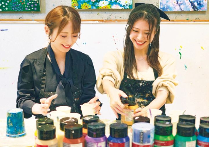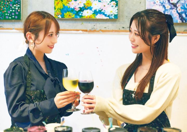 ワインを楽しみながら、アート体験ができちゃう。お酒の力を借りれば、思わぬクリエイティブな才能が発揮されるかも!?(左・福沢ゆうかさん、右・有村りりさん)