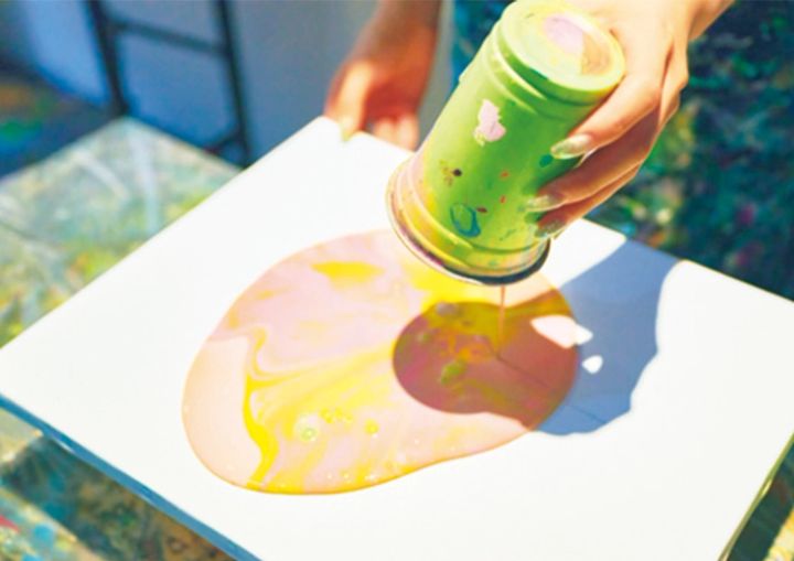 ついに見せ場!絵の具の量や傾け方によって変わるグラデにうっとり。きれいな模様ができていく瞬間を、ぜひ写真におさめて。