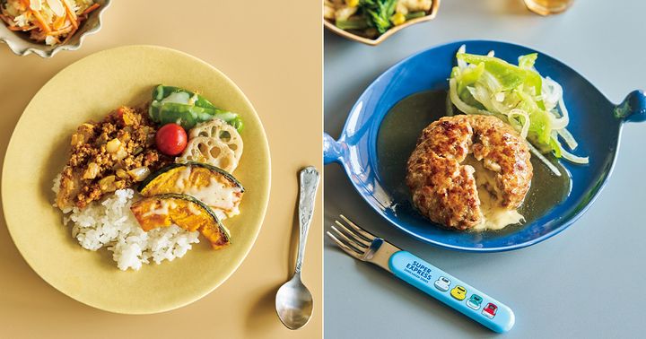 ハンバーグにお箸を入れるとシズル感たっぷりにチーズがあふれ、撮影現場は大盛り上がり。子どもも喜んでくれるはず。副菜との味のバランスも◎。(藤井)