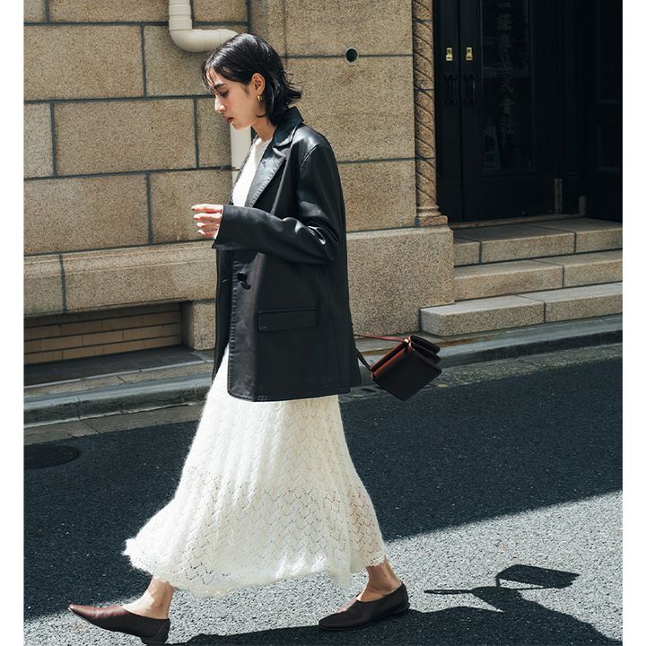 繊細なニットレースのワンピースは、ボディと切り替えられた袖と裾の編み地がレースのフリルのような表情を生む手の込んだ一枚。そんなロマンチックなワンピースにレザーのタフさが理想のカジュアルダウンを叶えます。
