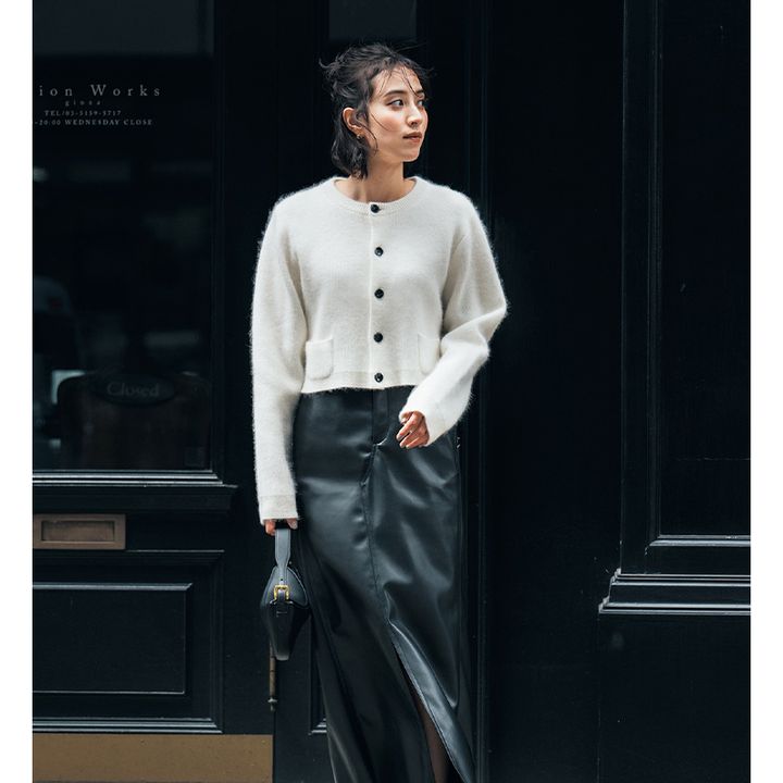 小ぶりなアウトポケットと黒ボタンの存在でコンフィなカーディガンが一気にジャケット見えするママ得感満点な一枚。黒レザー調のスカートで切れ味よく。