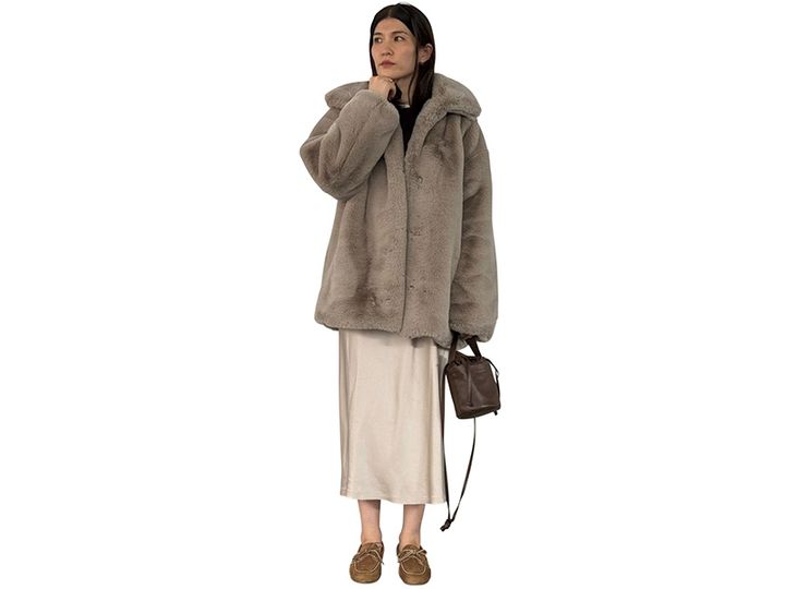 「キュートなもこもこのエコファーコートは甘めなムードに仕上げつつもどんなインナーとも合わせやすいのが魅力」