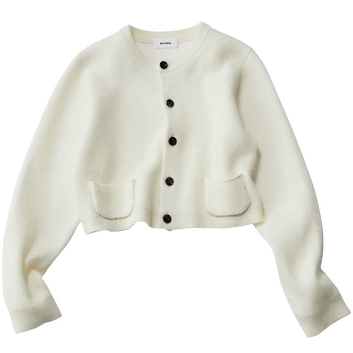 ちびポケットがあるだけで ふんわりニットカーデも ジャケ見えのきちんと感
