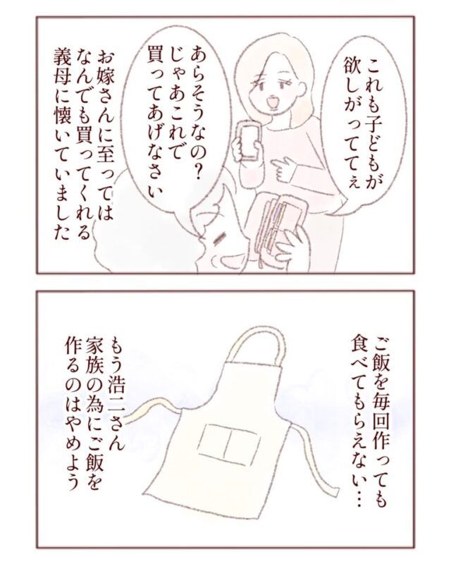 義母は毎回、浩二さんたちのために食事を準備するように言うので従っていましたが、結局外で食べることになり出かけてしまうので、食べてもらえたことがありません。もう浩二さんたちが来るからといってわざわざ食事を作るのはやめることにしました。