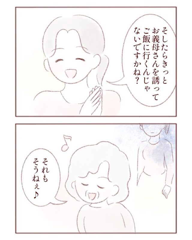 「お義母さんを誘ってご飯に行くんじゃないですかね?」と努めてポジティブにいうと、「それもそうね」とご機嫌になる義母。複雑な気持ちです。
