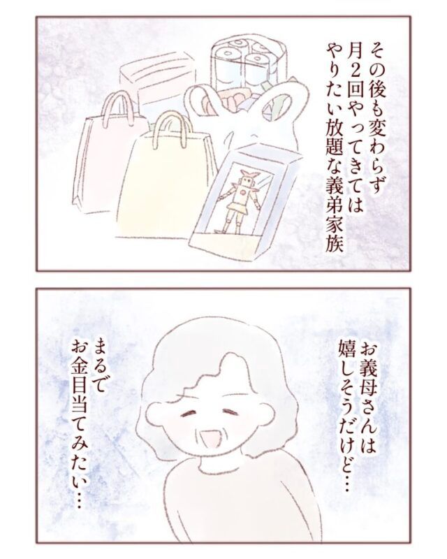 相変わらず月に2度、泊りに来ては義母にたくさんの物を買ってもらって帰っていく浩二さん家族。義母は嬉しそうですが、まるでお金目当てみたい、と思ってしまうのが正直な気持ちです。