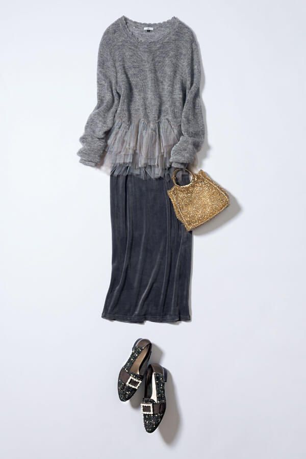 リュクスなベロア素材のIラインスカートを入れることで、モヘアニットが途端にフェミニンな表情に。仕上げはゴールドのミニバッグで華やかさをトッピングして。