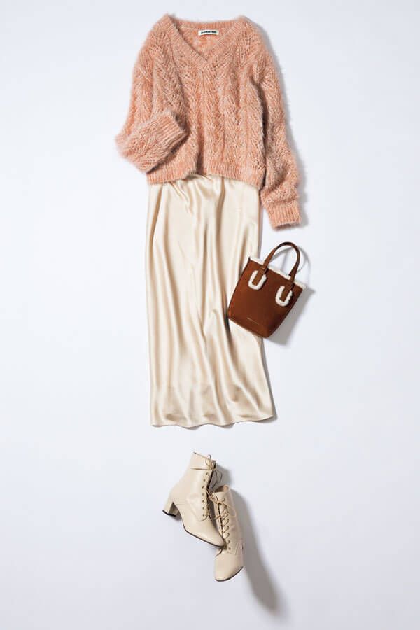 柔らかな空気を運ぶシャギーニットは、大胆なVネックが美しい首元を演出。×サテンスカートでカジュアルなのにどこかセンシュアルなムードに。