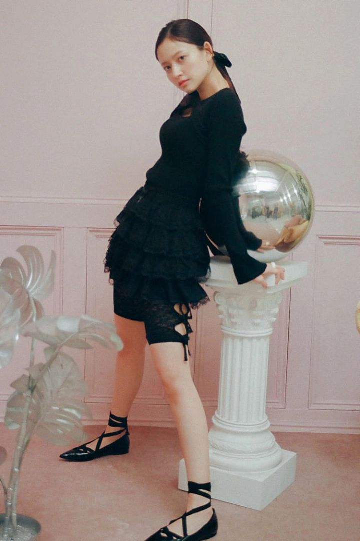 黒フリルスカート 4,690円/NADIA FLORES EN EL CORAZON 黒リボンレギンス 4,980円/Treat Ürself 黒レースニット 7,700円/RESEXXY アイボリーリング 16,500円、ゴールドイヤカフ 8,800円/ともにアビステ 黒リボンパンプス 9,500円/チャールズ&キース(チャールズ&キース ジャパン) ヘアリボン/スタイリスト私物