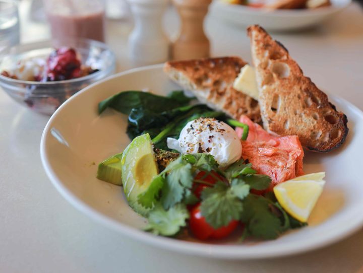ワンプレートのフレッシュオージーブレックファストには、ポーチドエッグ、グラブラックス(北欧風塩漬け)サーモン、チェリートマトサルサなどがカジュアルに盛り付けられていました。