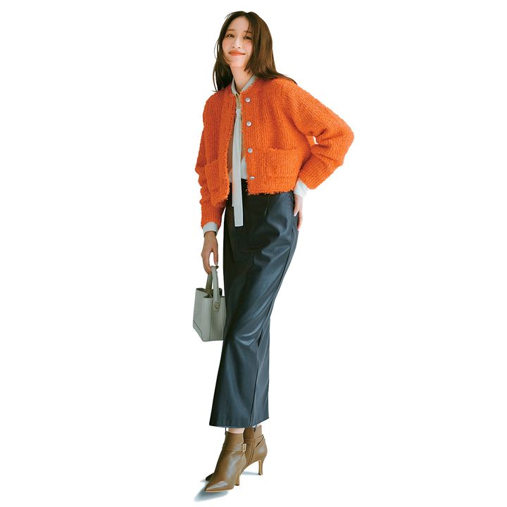 ファンシーヤーンのリッチな素材感と金ボタンのディテールで、「オレンジ」がエレガントに仕上がるのが魅力。ニットジャケットは程よい短丈で、大人も気負いなく挑戦できます。ニットジャケット¥19,800(スリースクエア)シャツ¥22,000スカート¥19,800(ともにマイカ アンド ディール/マイカ アンド ディール 恵比寿店)バッグ¥20,900(メゾン ヴァンサン/フラッパーズ)ブーツ¥30,800(ダイアナ/ダイアナ 銀座本店)