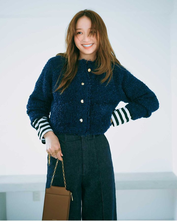休日はもちろんお仕事でも活躍する、上品な「ネイビーブルー」。ボーダーとデニムのカジュアルの王道コンビが、ニットジャケットの華やかな存在感でクラスアップします。デニムはインディゴカラーを選んで全体を落ち着いた色合いでまとめると、秋冬らしい装いに。ニットジャケット¥19,800(スリースクエア)カットソー¥17,600(ルミノア/ゲストリスト)デニムパンツ¥29,700(ヤヌーク/カイタックインターナショナル)バッグ¥26,400(オルセット/オルサ)