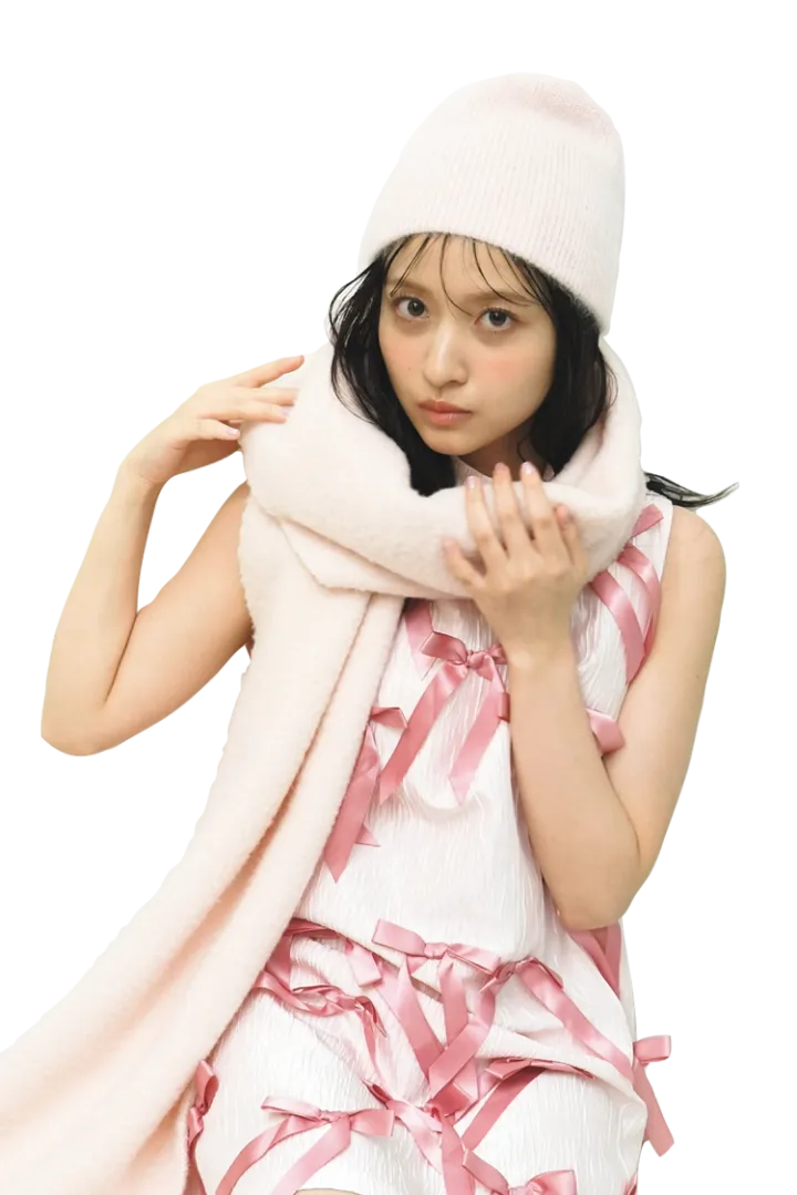 ピンクリボンワンピース 22,800円/シスタージェーン(ザ・ウォール ショールーム) ニット帽 5,500円/レイ ビームス(レイ ビームス 新宿)マフラー 2,990円/UNIQLO