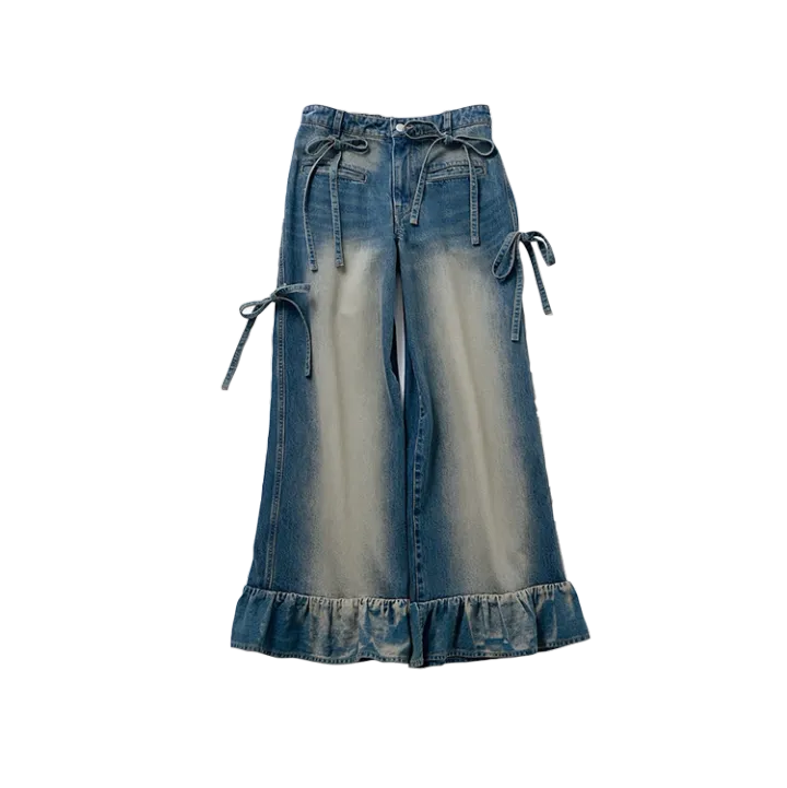 カジュアルなデニムもリボンデザインを選んでフェミニンに♡ すそ部分のフリルで、さらにガーリーエッセンスをプラス。