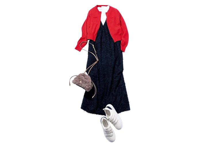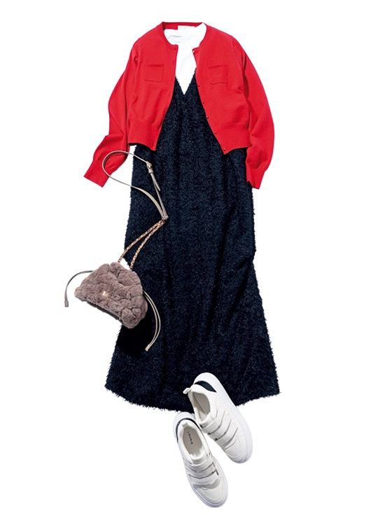 リラックスして働けるよう、動きやすいワンピースとスニーカーで足元を整えながら、羽織りを活用して体温調整。夏に活躍した白Tもフリンジワンピ&ニットカーデを合わせれば秋まで着回せる!ベーシックでまとめて秋らしい赤カーデを引き立てて。