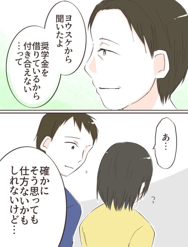とうとう彼ヨウスケさんの家に行くことになったまひろさん、「・・怖い・・また反対されたらどうしよう」と以前の記憶から怯えていました。「入って入って!」と明るく出迎えてくれるヨウスケさんと、ご両親に挨拶した後、「奨学金を借りて大学に行ったんだっけ?」とお父さんにたずねられ「・・はい」覚悟しながら返事をしたまひろさん、でも「そうかそうか・・がんばってたんだね」お父さんの言葉は、とても意外なものでした。