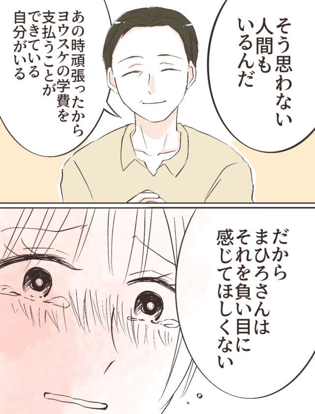 「そう思わない人間もいるんだ。あの時がんばったから、ヨウスケの学費を支払うことができている自分がいる。だから、まひろさんはそれを負い目に感じてほしくない」お父さんの心のこもった言葉に、まひろさんの目から涙が溢れました。