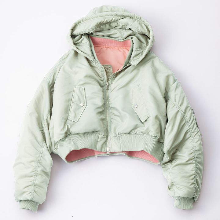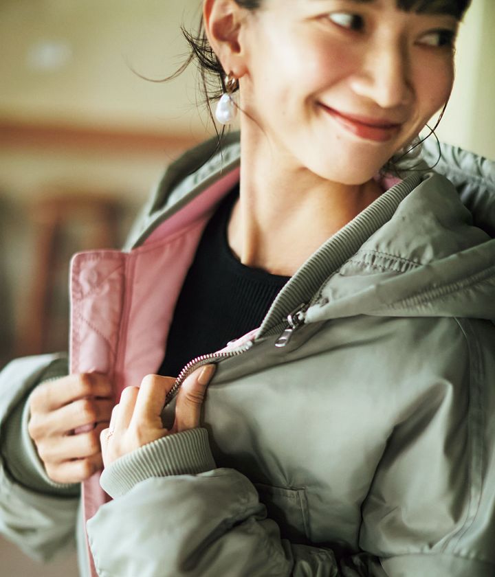 主張しすぎないカーキ×ピンクのリバーシブルMA-1。フードは取り外しもできるから使い勝手抜群。
